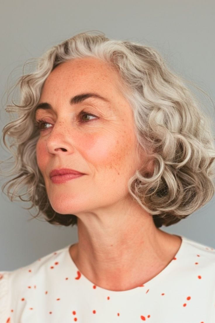 Make sure you have a nice cut and are doing something to put in a little curviness in the way you style it. Every lady can benefit from brushing the hair back from the brow, even if it then falls straight down. Try that upside-down and flipping back trick to add volume.