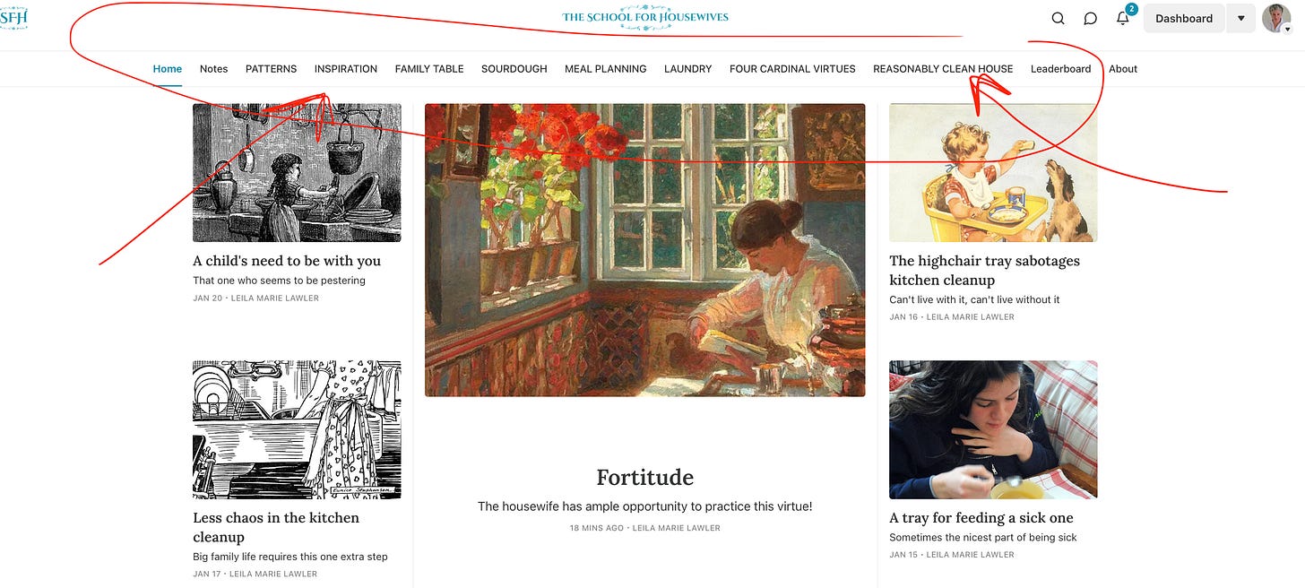 If you go to the main page of The School for Housewives, you will see categories up at the top. Clicking on one of those will show you the posts in that category. And all the posts are arranged there as well.